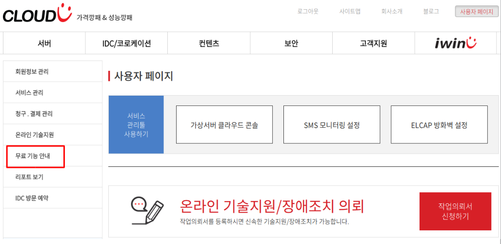 2. 왼쪽 메뉴 바에서 '무료기능 안내' 를 선택합니다.