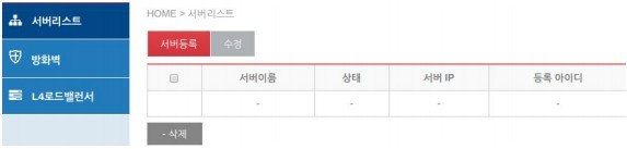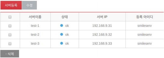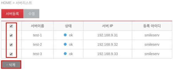 서비리스트의 표에 존재하는 체크박스에서 제거하고자하는 서버를 체크 후 삭제를 클릭합니다.