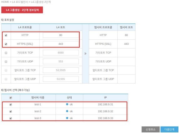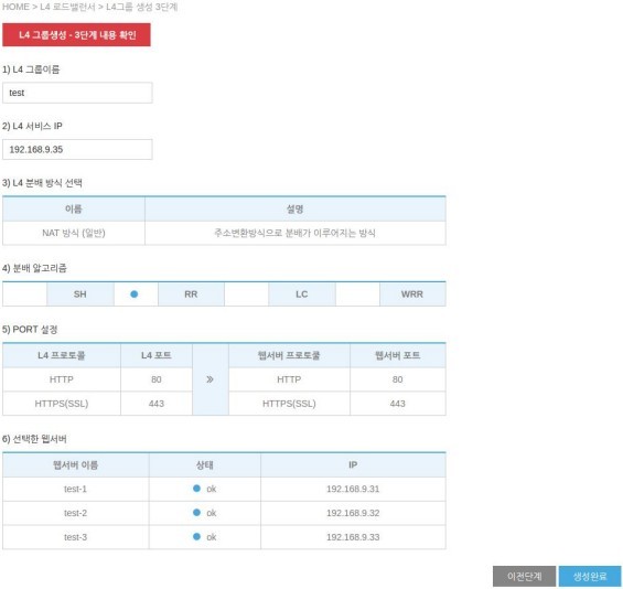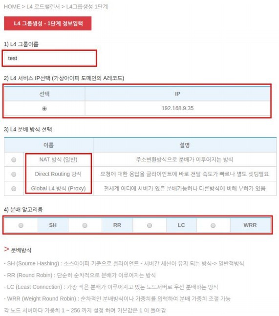 1 단계에서는 L4 그룹의 이름과 서비스 IP, 분배 장식, 분배 알고리즘을 선택합니다.