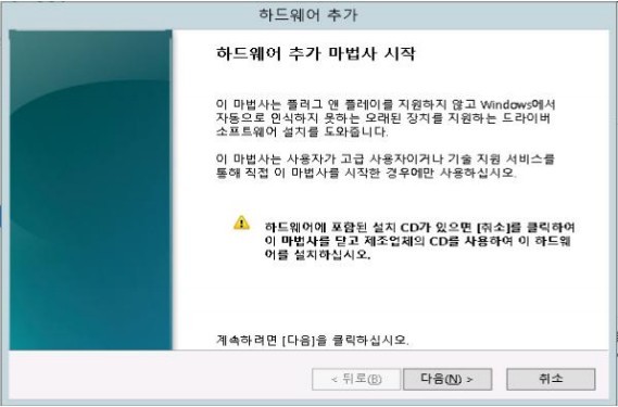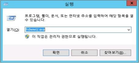 윈도우 실행창에 hdwwiz.exe 명령어를 입력해서 하드웨어 추가 마법사를 시작합니다.