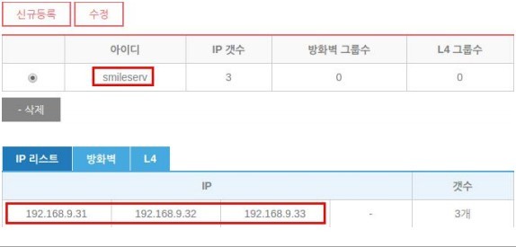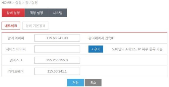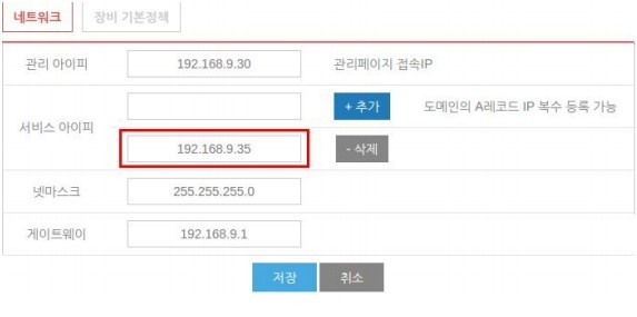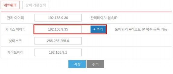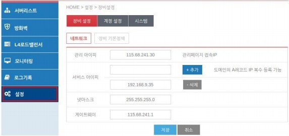 장비 설정에서 L4 로드밸런서에 이용할 서비스 아이피(대표 아이피)를 추가 후 저장해줍니다.