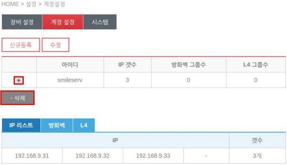 L4 로드밸런서 설정을 위해 '장비설정'과 '계정설정'을 설정합니다.