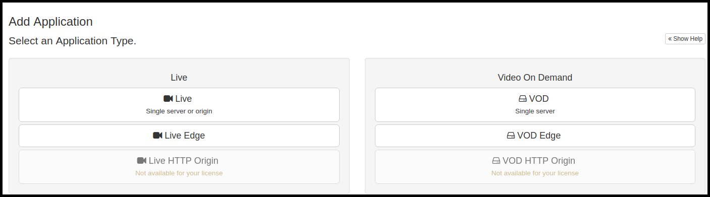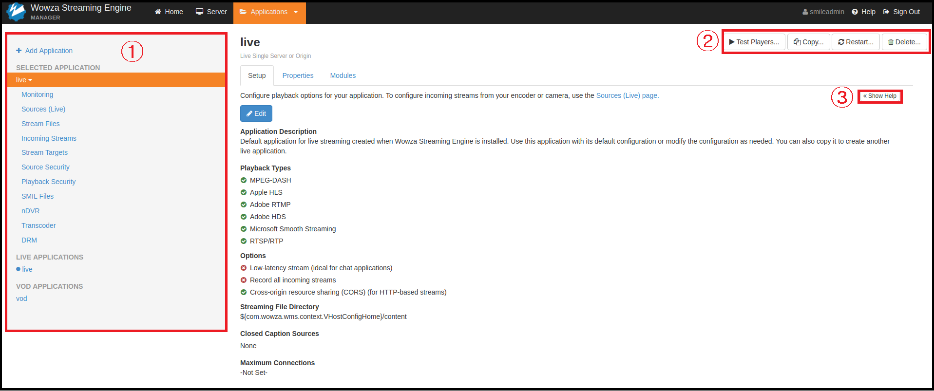 ① 상단 막대메뉴 - 상단 막대 메뉴의 각 버튼을 클릭하면 서버 및 가상 호스트 를 관리하거나 라이브 및 VOD (Video-on-Demand) 응용 프로그램을 만들고 관리하는 페이지로 넘어갈수 있습니다. - Help ( 도움말 ) 버튼을 클릭하여 추가적인 wowa 기술 자료 및 기타 리소스를 찾을 수 있습니다.