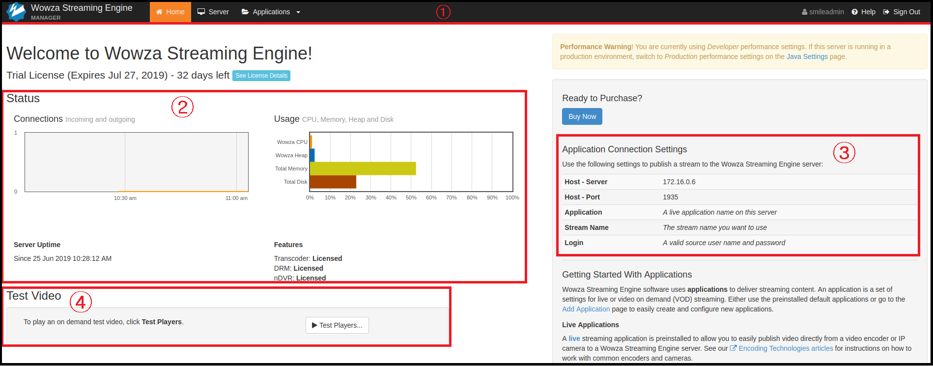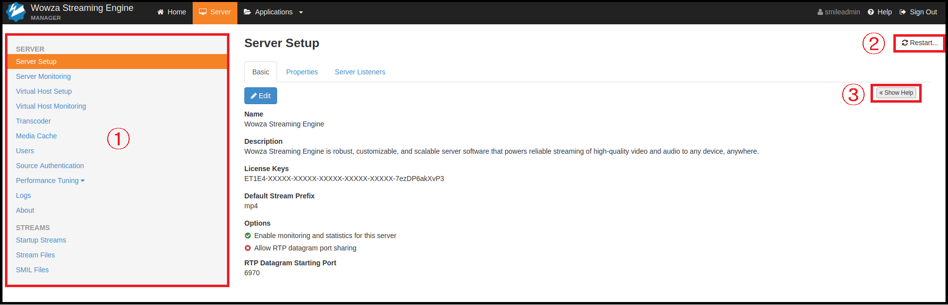 서버 설정 : 인스턴스 이름, 사용 가능한 라이센스 키 및 서버 및 해당 응용 프로그램에 대한 모니터링 기능 활성화 / 비활성화와 같은 Wowza Streaming Enginer에 대한 설정을 구성합니다.