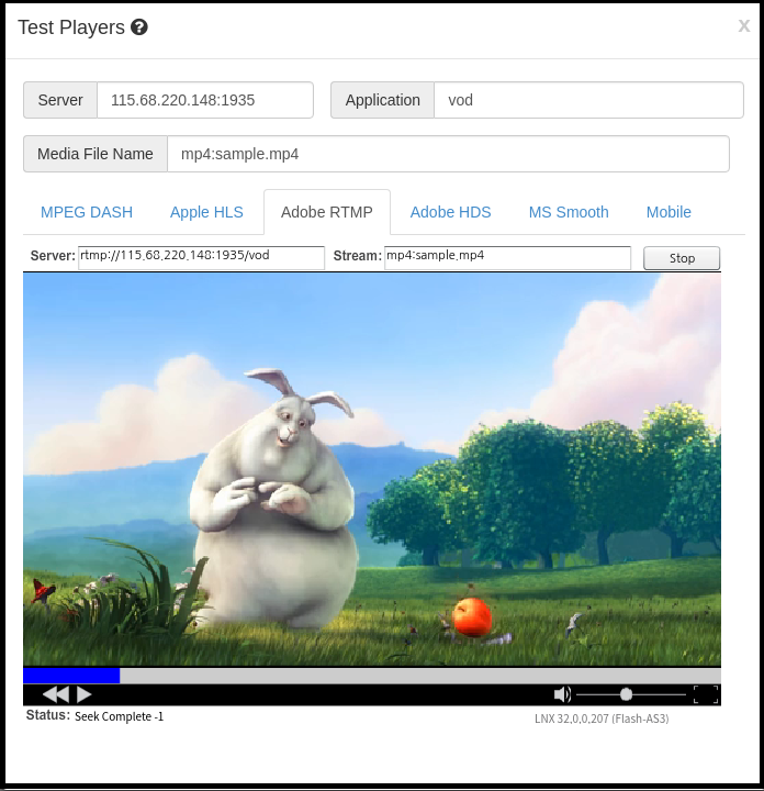 ④ 테스트 플레이어 - 테스트 플레이어를 사용하여 여러 스트리밍 프로토콜을 통해 서버 소프트웨어와 함께 설치된 sample.mp4 비디오 파일을 스트리밍하여 서버 가 정상적으로 작동하는지 확인이 가능합니다.