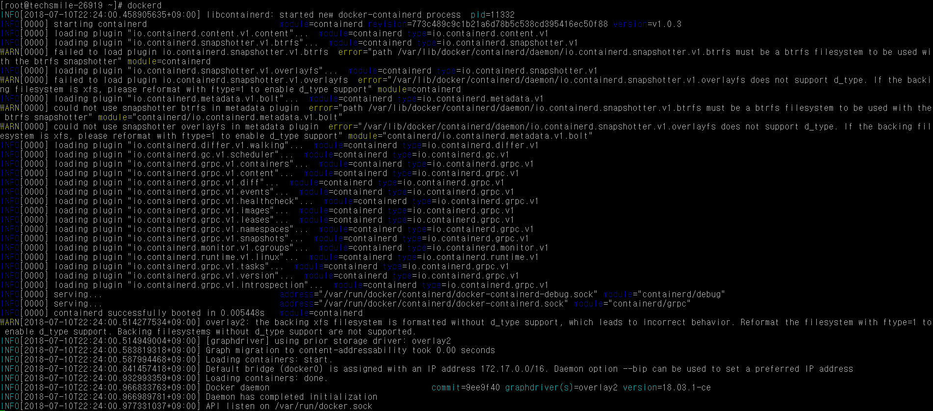 만약 백그라운드 모드로 실행하고 싶다면 'dockerd' 명령어 끝에 '&'를 붙여서 실행해야 합니다.